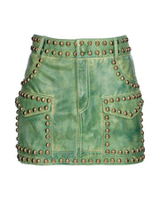 Ready to hit the streets in style? Then Carmine Cargo Skirt is your ticket! This 100% leather mini skirt is a lightweight leather, with its hand-painted detail and edgy cargo-like feel. The studs will turn heads wherever you go! Make your fashion statement today.